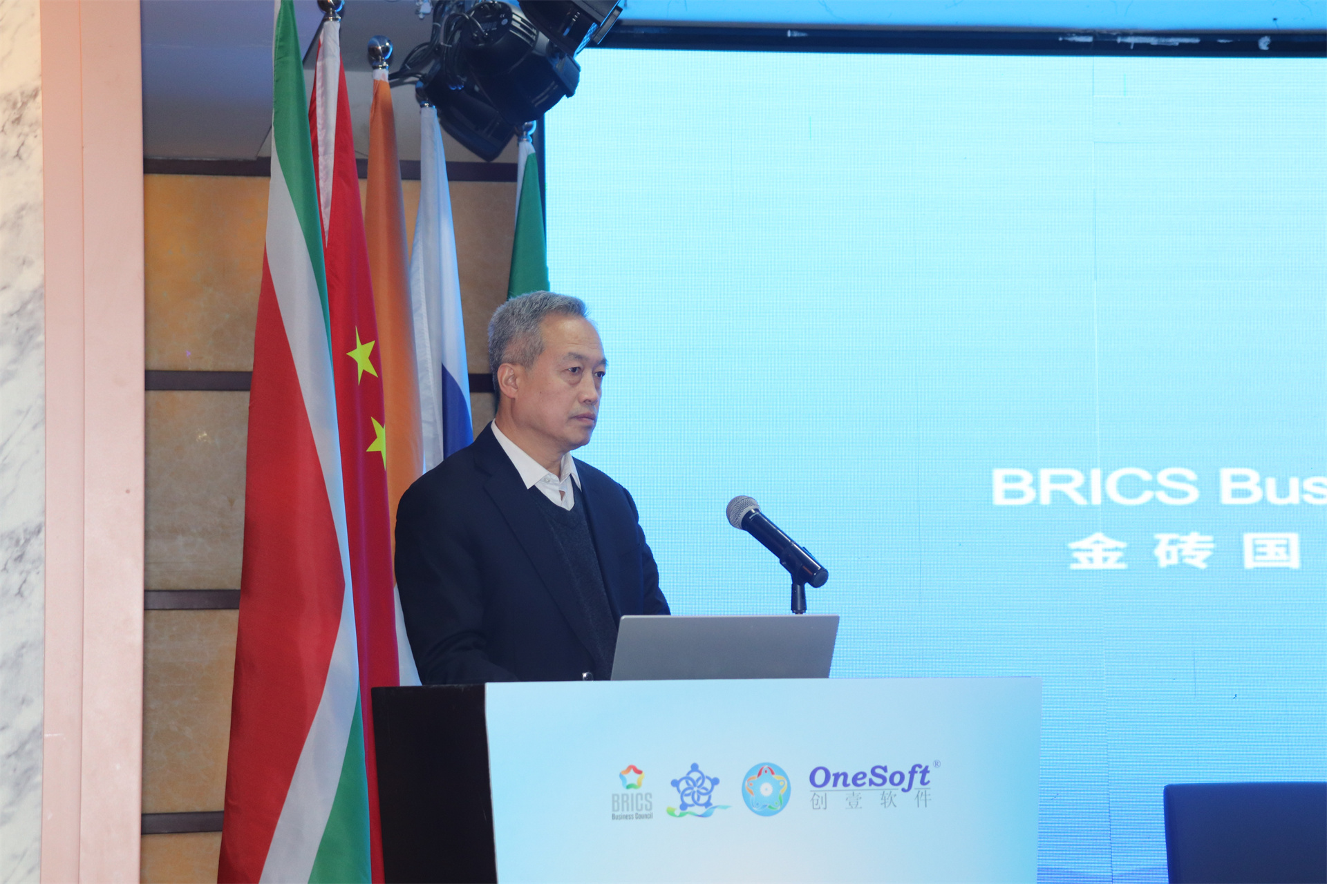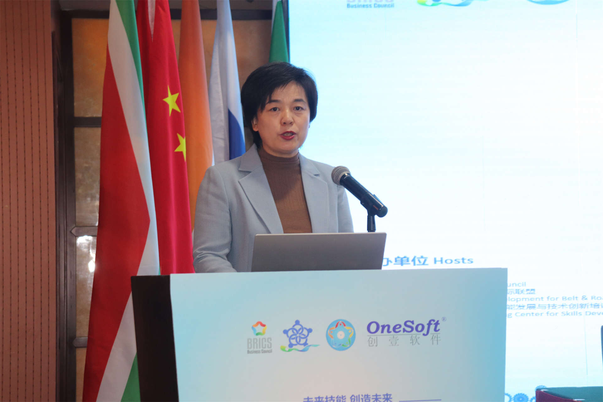 ▲金磚國家工商理事會(中方)技能發(fā)展工作組組長、金磚國家技能發(fā)展與技術(shù)創(chuàng)新大賽組委會執(zhí)委會主席劉振英視頻致辭