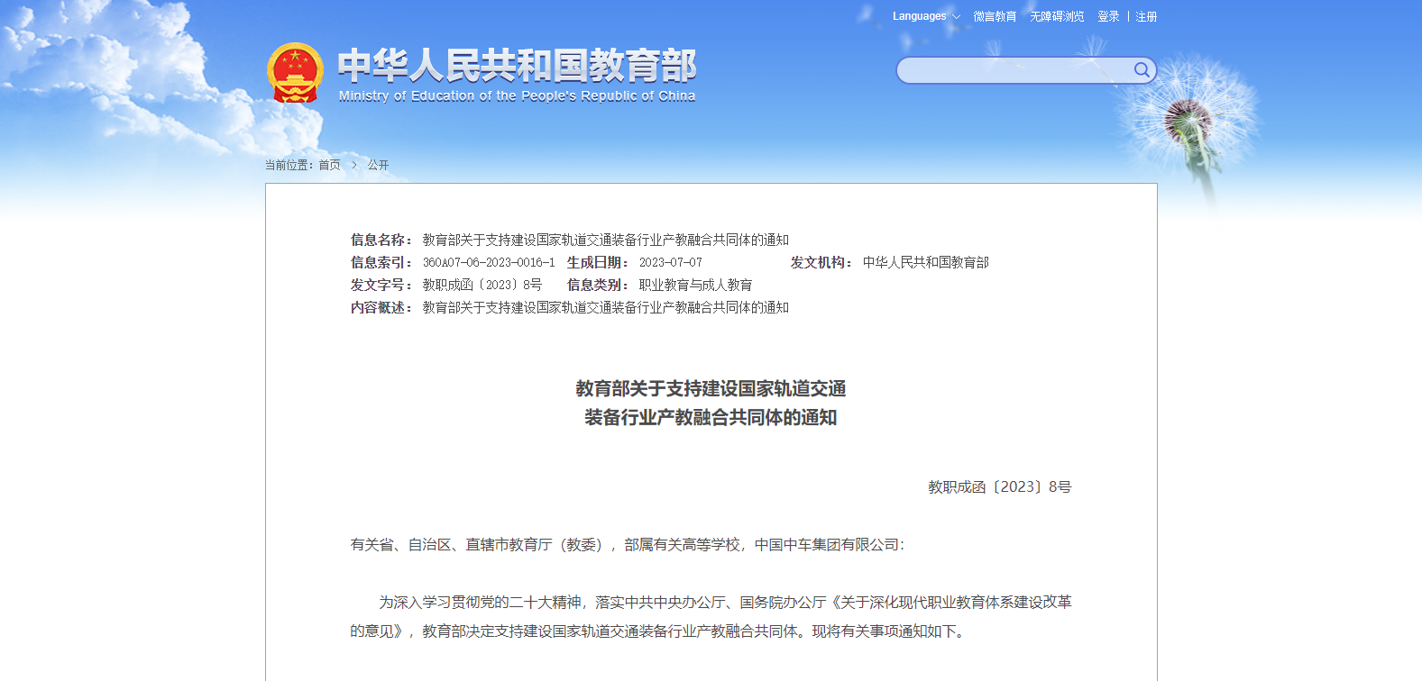 為深入學(xué)習(xí)貫徹黨的二十大精神,落實(shí)中共中央辦公廳、國(guó)務(wù)院辦公廳《關(guān)于深化現(xiàn)代職業(yè)教育體系建設(shè)改革的意見(jiàn)》,教育部決定支持建設(shè)國(guó)家軌道交通裝備行業(yè)產(chǎn)教融合共同體。現(xiàn)將有關(guān)事項(xiàng)通知如下。