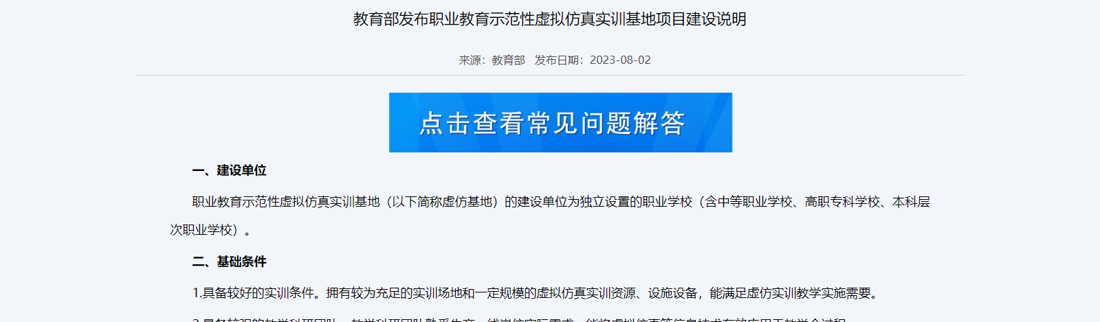 職業(yè)教育示范性虛擬仿真實(shí)訓(xùn)基地(以下簡稱虛仿基地)的建設(shè)單位為獨(dú)立設(shè)置的職業(yè)學(xué)校(含中等職業(yè)學(xué)校、高職??茖W(xué)校、本科層次職業(yè)學(xué)校)。