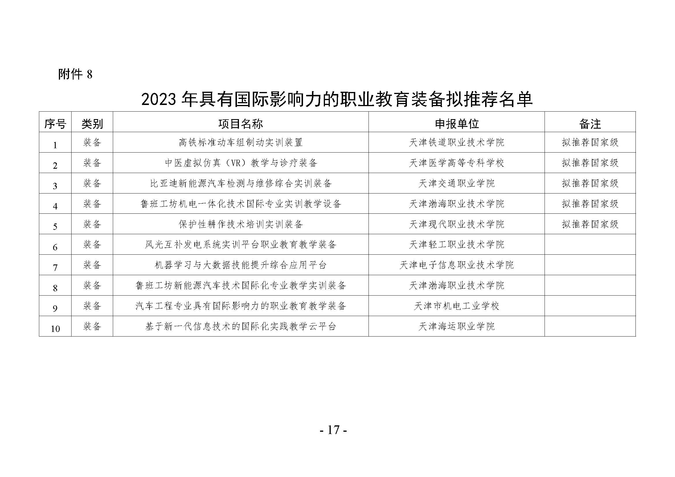 10月17日,天津市教育委員會(huì)在其官方發(fā)布《關(guān)于現(xiàn)代職業(yè)教育體系建設(shè)改革相關(guān)重點(diǎn)任務(wù)天津市擬推薦名單的公示》的通知,根據(jù)教育部辦公廳《關(guān)于加快推進(jìn)現(xiàn)代職業(yè)教育體系建設(shè)改革重點(diǎn)任務(wù)的通知》(教職成廳函〔2023〕20號(hào))相關(guān)要求,市教委組織開展了職業(yè)教育一流核心課程、優(yōu)質(zhì)教材、校企合作典型生產(chǎn)實(shí)踐、具有較高國(guó)際化水平的職業(yè)學(xué)校、具有國(guó)際影響力的職業(yè)教育標(biāo)準(zhǔn)、資源、裝備等項(xiàng)目申報(bào)工作,經(jīng)學(xué)校申報(bào)、專家評(píng)審等程序,將現(xiàn)代職業(yè)教育體系建設(shè)改革重點(diǎn)任務(wù)擬入選市級(jí)項(xiàng)目及天津市擬推薦名單予以公示。