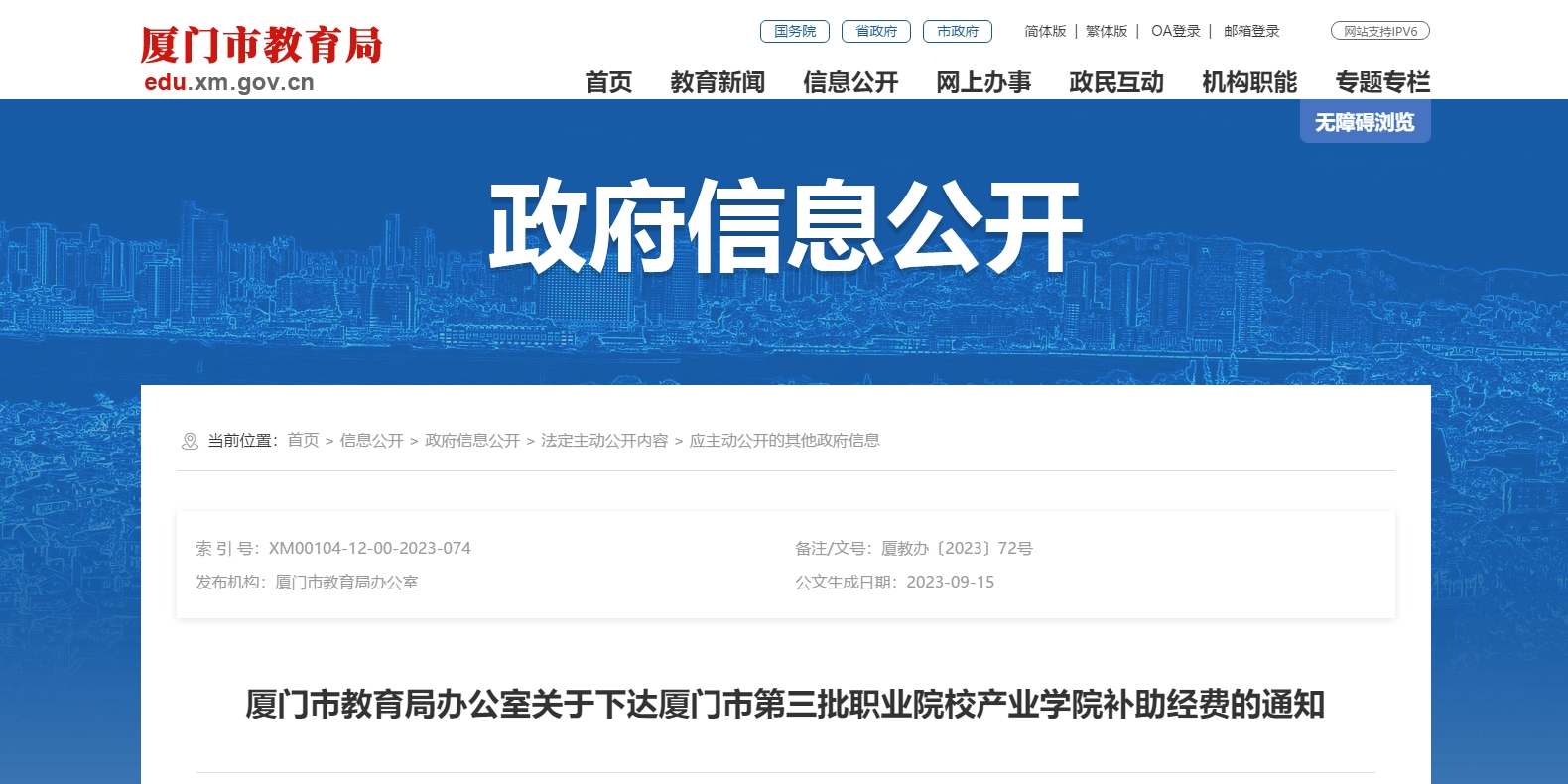 近日,廈門市教育局發(fā)布《廈門市教育局辦公室關(guān)于下達(dá)廈門市第三批職業(yè)院校產(chǎn)業(yè)學(xué)院補(bǔ)助經(jīng)費(fèi)的通知》,本次下達(dá)的補(bǔ)助資金為每個(gè)立項(xiàng)產(chǎn)業(yè)學(xué)院50萬元。本次下達(dá)的廈門市第三批職業(yè)院校產(chǎn)業(yè)學(xué)院補(bǔ)助經(jīng)費(fèi),應(yīng)用于產(chǎn)業(yè)學(xué)院項(xiàng)目建設(shè)和日常運(yùn)營(yíng),包括專業(yè)建設(shè)及課程建設(shè)、實(shí)驗(yàn)室及實(shí)習(xí)實(shí)訓(xùn)基地建設(shè)、教師能力提升、校企聯(lián)合開展科研課題等項(xiàng)目。