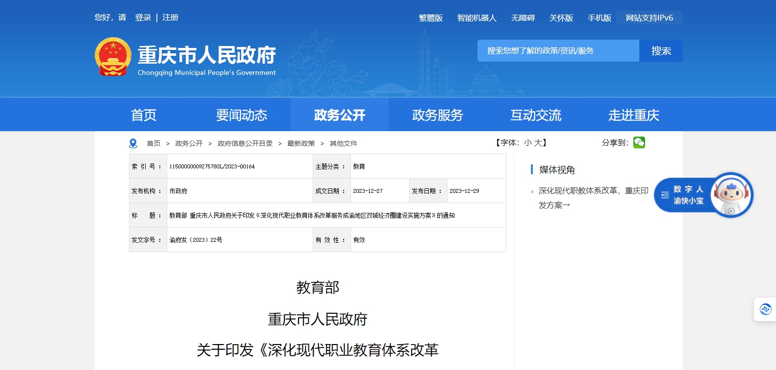 近日,重慶市人民政府官網(wǎng)發(fā)布教育部 重慶市人民政府 關(guān)于印發(fā)《深化現(xiàn)代職業(yè)教育體系改革 服務(wù)成渝地區(qū)雙城經(jīng)濟(jì)圈建設(shè)實(shí)施方案》的通知,通知中明確實(shí)施職業(yè)教育數(shù)字化行動(dòng),做大做強(qiáng)重慶智慧教育平臺(tái),建設(shè)國(guó)家級(jí)職業(yè)教育在線(xiàn)精品課程100門(mén)左右、規(guī)劃教材300種左右、專(zhuān)業(yè)教學(xué)資源庫(kù)10個(gè)左右、虛擬仿真實(shí)訓(xùn)基地15個(gè)左右。實(shí)施教師能力提升行動(dòng),教育部支持重慶市承辦全國(guó)職業(yè)院校技能大賽教學(xué)能力比賽和德育與思想政治教育有關(guān)賽項(xiàng),建設(shè)一批“雙師型”教師培養(yǎng)培訓(xùn)基地、教師教學(xué)創(chuàng)新團(tuán)隊(duì)、教師企業(yè)實(shí)踐基地和示范性教師企業(yè)實(shí)踐流動(dòng)站,推動(dòng)企業(yè)工程技術(shù)人員、高技能人才和職業(yè)學(xué)校教師雙向流動(dòng)。實(shí)施終身學(xué)習(xí)質(zhì)量提升行動(dòng),推進(jìn)成渝地區(qū)雙城經(jīng)濟(jì)圈學(xué)分銀行建設(shè),開(kāi)展多種形式的職業(yè)教育資格資歷互認(rèn),建設(shè)一批示范性職工培訓(xùn)基地,打造一批職業(yè)學(xué)校老年教育、社區(qū)教育示范基地。