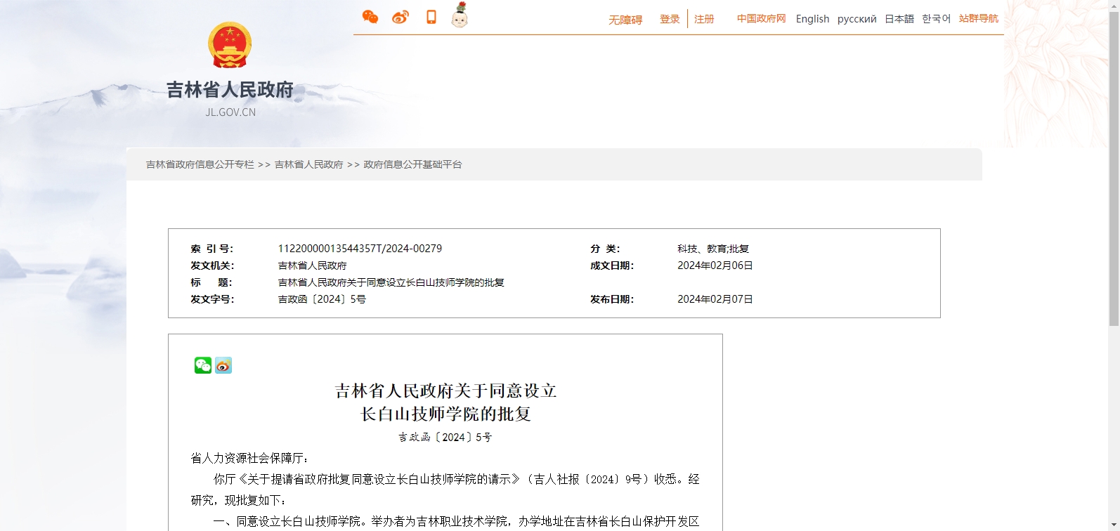 吉林省人民政府關(guān)于同意設(shè)立長(zhǎng)白山技師學(xué)院的批復(fù)