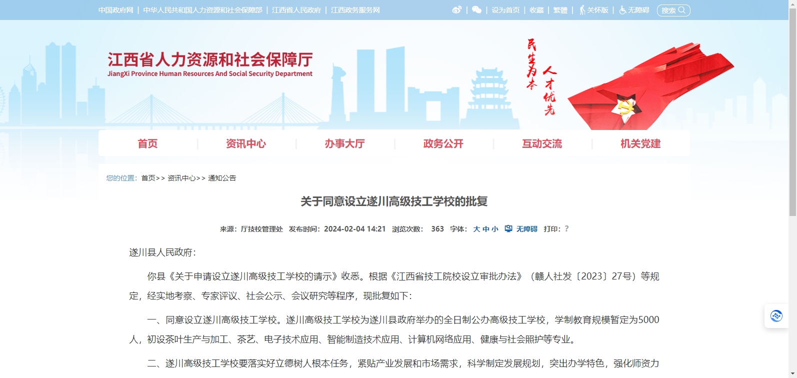 一、同意設立遂川高級技工學校。遂川高級技工學校為遂川縣政府舉辦的全日制公辦高級技工學校,學制教育規(guī)模暫定為5000人,初設茶葉生產(chǎn)與加工、茶藝、電子技術(shù)應用、智能制造技術(shù)應用、計算機網(wǎng)絡應用、健康與社會照護等專業(yè)。