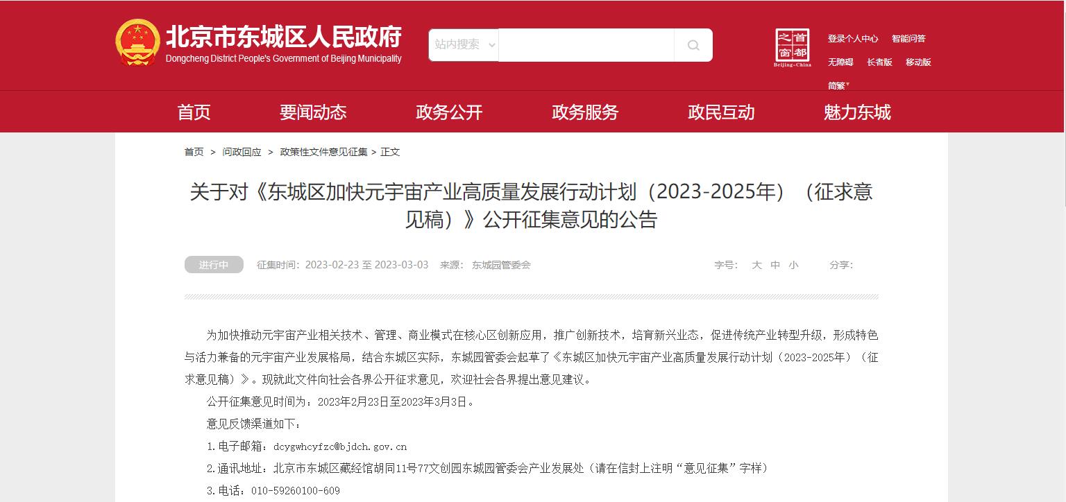 北京市東城區(qū)發(fā)布《東城區(qū)加快元宇宙產(chǎn)業(yè)高質(zhì)量發(fā)展行動(dòng)計(jì)劃(2023-2025年)(征求意見稿)