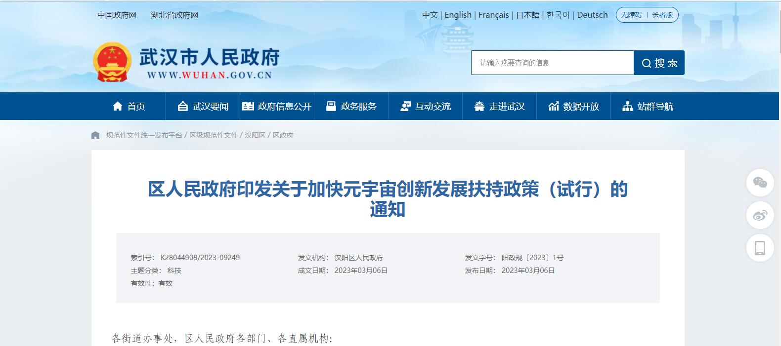 武漢發(fā)布《漢陽區(qū)關(guān)于加快元宇宙創(chuàng)新發(fā)展扶持政策(試行)》