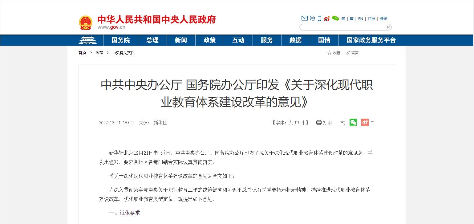 國(guó)務(wù)院印發(fā)《關(guān)于深化現(xiàn)代職業(yè)教育體系建設(shè)改革的意見(jiàn)》